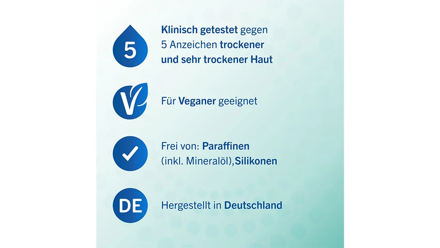 - Klinisch getestet gegen 5 Anzeichen trockener und sehr trockener Haut